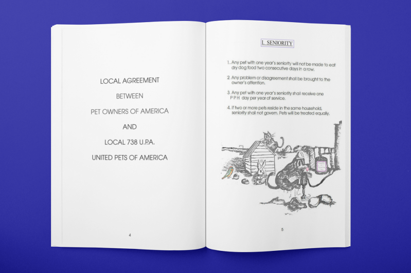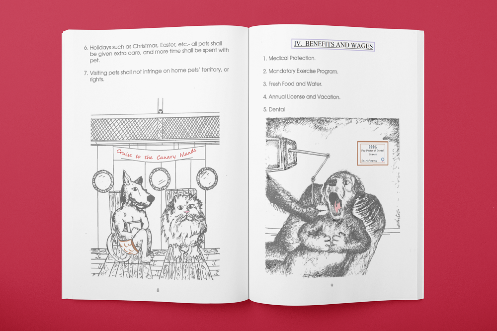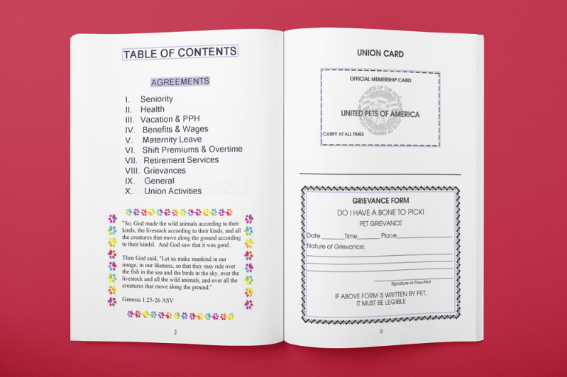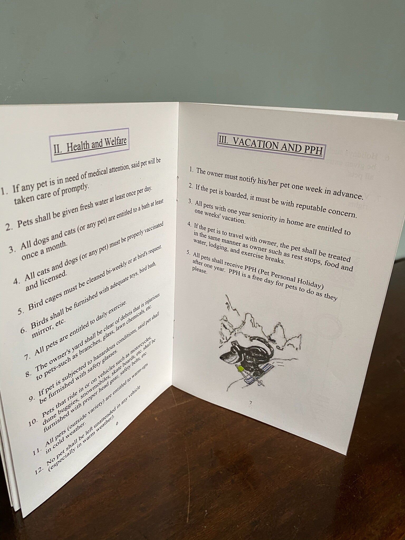 This section lists the Health and Welfare. “Pets shall be given fresh water every day,” or “Birds shall be furnished with adequate toys, birdbath, mirror, etc.” We can’t forget the Vacation and PPH (Pet Personal Holiday) section! In addition, let's not forget Benefits and Wages and the classic Maternity Leave. (Rabbits shall receive as many as needed) Shift Premiums and Overtime are a must in our Pet Union booklet! !